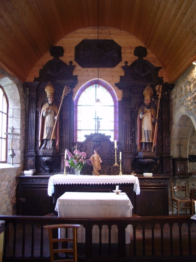 Autel de plan rectangulaire et élévation droite ; retable architecturé à trois travées ; la travée centrale, dans l'axe de la baie, est occupée par un relief, et au-dessus de la baie nous trouvons un grand cartouche octogonal ; les corps latéraux sont surmontés chacun d'un fronton polygonal, leur partie basse étant constituée d'un meuble de rangement. Assemblage à coupe droite.