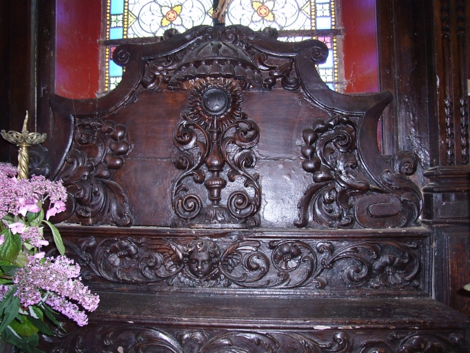 La figure du Saint-Esprit se trouve dans le grand cartouche surmontant la baie centrale.