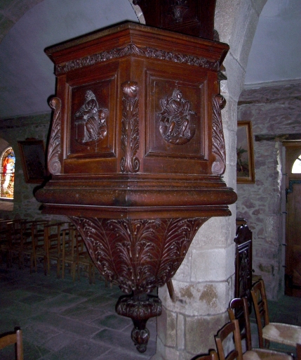 Description : les évangélistes sur la cuve, les Docteurs de l'Eglise sur la rampe de l'escalier, le Bon Pasteur sur le dorsal, l'ange au sommet de l'abat son.