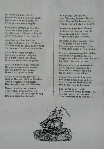La première gwerz, étudiée, manuscrite, est rédigée en breton. La seconde gwerz est dactylographiée sur un papier recto-verso, illustrée par Francis Guillou (1979).