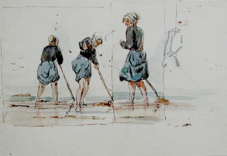 Outil en fer forgé emmanché. Le manche en bois mesure 1, 50 mètres de longueur et le croc 31 cm, avec un écartement de 12 cm entre les deux doigts ou fers. Cet outil est utilisé par les goémoniers à pied pour ramasser le goémon épave. Le manche de cet outil a été cassé.