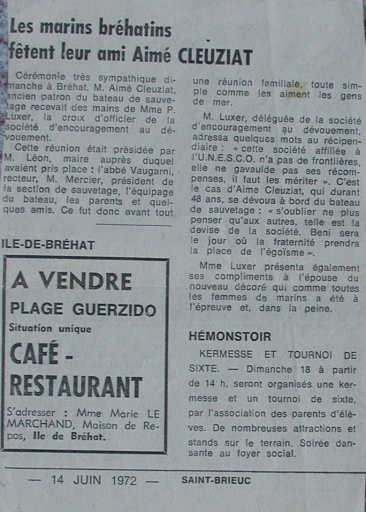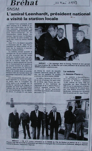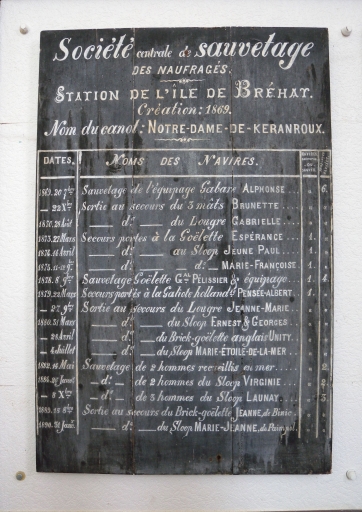 En 1869, le canot aux avirons 'Notre-Dame-de-Keranroux' fut le premier bateau de sauvetage de l'Île de Bréhat (Société Centrale de Sauvetage des Naufragés), avant la construction des bâtiments de la station en 1880. Ce canot à redressement fut le N° 20 de la série construit par la chantier Augustin Normand. Il effectua de nombreux sauvetages, barré par les patrons successifs Colin puis Kerjolis, notamment en 18884 et en 1896, où le canot secoura et sauva un marin-pêcheur et ses trois enfants. Son dernier sauvetage eut lieu en 21 janvier 1909 : sauvetage du canot 'Frères et Soeurs'. Le bateau fut remplacé en 1910 par le canot à grande stabilité 'Albert-Henriette', patron Joseph Voland. Il effectua 50 sorties aux avirons avant de partir en 1925 à Trébeurden. Le premier canot à moteur, 'François-Henri-Provençal', fut mis en service en 1925, baptisé en 1927 et naviguera jusqu'en 1951 (patron Joseph Volant et Aimé Le Cleuziat). Son premier sauvetage eut lieu en 1936. Les canots motorisés se sont ensuite succédés : L'Amiral Duperey, le 'Maréchal Lyauthey', 'L'Amiral Lacaze et le 'Nadault de Buffon' (1951-1974), patron Louis Alainguillaume et/ou Aymé Cleuziat. Le dernier bateau de sauvetage de la station fut le canot 'tout temps', vedette de première classe la 'Jeanne-Pierre', commandée par Jean Floury (armateur de vedettes à passagers). La station a fermé en 1992 et le bateau est parti définitivement pour Loguivy-de-la-Mer. L'équipage de la 'Jeanne-Pierre' était composée de Yves Tardivel (bosco, mécanicien) et de Rémi Alain (radio). François Geffroy et Michel Bocher se joignaient régulièrement à l'équipage. Le derniers sauvetage fut celui d'un trimaran en juillet 1990. Les bateaux repérés ont été documentés à partir des témoignages oraux, de la documentation mise à disposition et des reproductions iconographiques. Aucun bateau de sauvetage a été étudié en particulier. Les bateaux de sauvetage en service à Bréhat ont tous disparu sauf la 'Jeanne-Pierre', actuellement en fonctionnement dans une autre station.