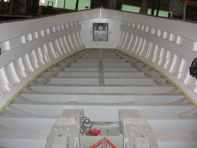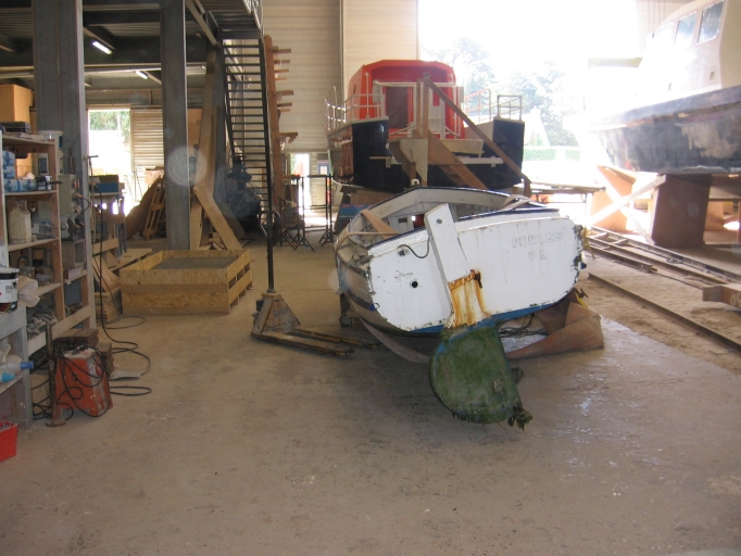 l = 715 ; la = 195. Longueur totale de la coque : 715 cm ; largeur au maître bau : 195 cm ; tirant d'eau : 70 cm ; largeur au tableau : 125 cm.
