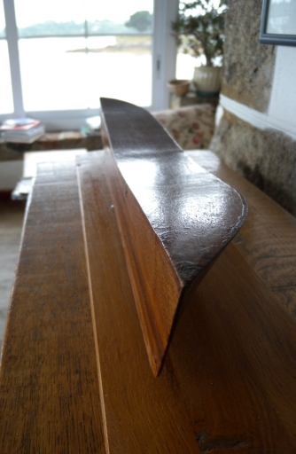 Demi-coque en bois tranché présentée sur un support en bois. La coque présente un arrière pointu ('cul de poule') et une étrave à guibre. Elle est plus tonturée que la coque originale construite par le chantier Rollnad en 1950.