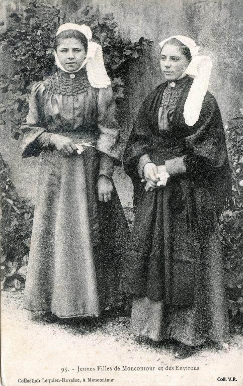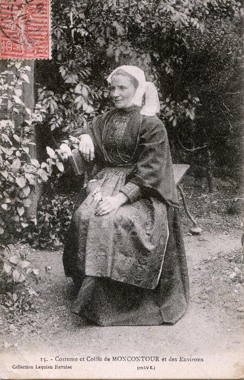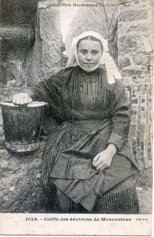 « Ces coiffes de Moncontour sont parfois surnommées « bonnets carrés », « coiffes carrées » ou « boites à laver », du fait de leur forme générale. Les coiffes de Langueux et d’Yffiniac forment un groupe proche, mais avec des caractéristiques qui sont restées archaïques, alors que les coiffes de Lamballe-Moncontour ont considérablement évolué. Les deux groupes n’en formaient sans doute qu’un seul autrefois. « La « coiffe carrée » d’Yffiniac (surnommée « boite à laver ») les a conservées [les ailes] plus larges que celles de Moncontour parce que son évolution a été arrêtée par l’invasion des bonnets de Saint-Brieuc » (H-F. Buffet, op.cit.).