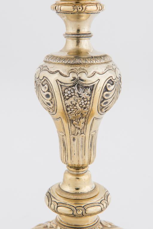 La structure et le décor de ce calice l’inscrivent parfaitement dans les modèles courants de la première moitié du XIXème siècle. Le pied est bombé à décor de larges palmettes dans des cartouches circulaires qui alternent avec le blé et la vigne autour d’un cartouche représentant la cité de Jérusalem et au premier plan la croix du sacrifice. Le décor est repris sur le nœud allongé entre deux collerettes d’oves. Des frises de rais de cœur scandent les différentes parties de l’objet. La fausse coupe ajourée alterne des médaillons assortis de nœuds de ruban ciselés de scènes de la Vie de la Vierge et du Christ : l’Education de la Vierge, la Crucifixion avec Marie représentée au pied de la croix, et l’Assomption.