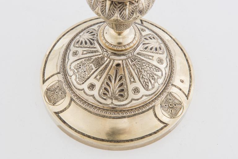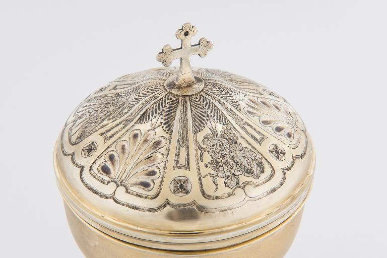 Ce ciboire d’un modèle simple reprend le motif des feuilles nervurées sur le nœud et au sommet du couvercle qui est entièrement ciselé des symboles de l’Eucharistie dans des cartouches à volutes alternant avec de larges palmettes. Ce dernier est monté à charnière sur la coupe unie, système de fixation que Mgr Barbier de Montault qualifia de « défaut » dans la deuxième moitié du XIXème siècle (Arminjon 1983, p.59). Le pied est également ciselé avec finesse du décor végétal habituel : blé, vigne, roseaux. O. Bourgeois, fabricant parisien peu prolifique, montre à travers cette pièce très sobre sa maîtrise de la ciselure et son souci du détail comme en témoigne la reprise de la croix sommitale du couvercle gravée et amatie de trois fleurons.