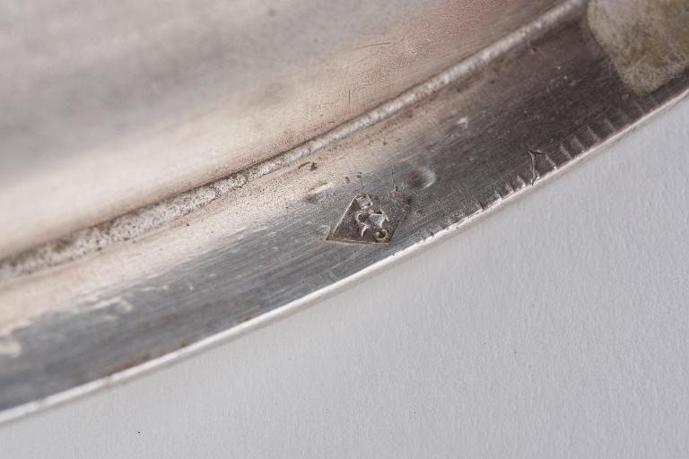 Poinçons (pied, coupe) : 1) poinçon de fabricant de Charles-Eugène Trioullier : dans un losange vertical, les initiales C et T séparées par une burette (pied) ; 2) poinçon de Paris, argent 1er titre, 1798-1809 (coupe) ; 3) poinçon de Paris, moyenne garantie d’or et d’argent, 1798-1809 (coupe) ; 4) poinçon de titre et de garantie Paris et départements, argent 1er titre, en usage à partir de 1838 (pied).
