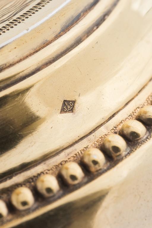 Poinçons (pied, coupe) : 1) poinçon de fabricant de Jules Jamain et Eugène Chevron : dans un losange horizontal, les initiales J & C, une grenade militaire en chef, une accolade en pointe ; 2) poinçon de titre et de garantie Paris et départements, argent 1er titre, en usage à partir de 1838.