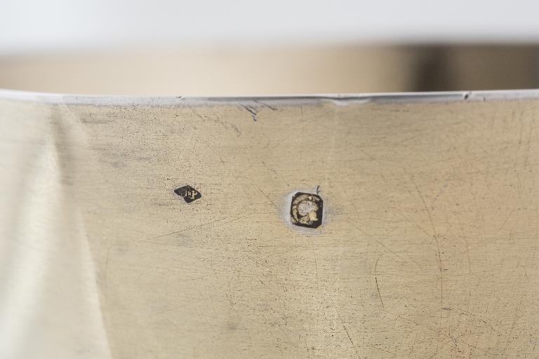 Poinçons (pied, coupe) : 1) poinçon de fabricant de Jean-Marie Pernolet : dans un losange horizontal, les initiales J et P séparées par une étoile ; 2) poinçon de titre et de garantie Paris et départements, argent 1er titre, en usage à partir de 1838.