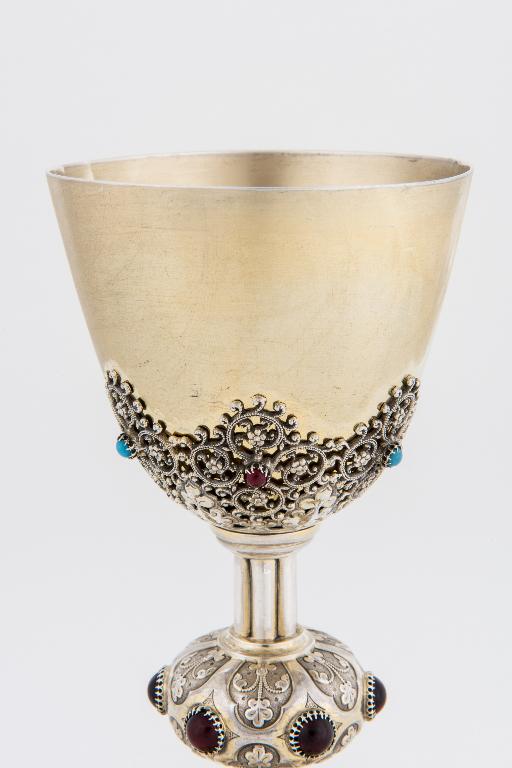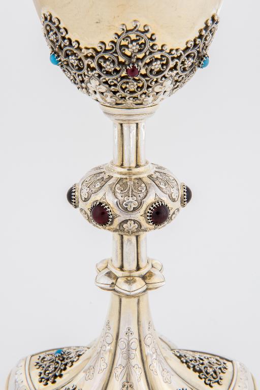 Le calice d’allure néogothique emprunte beaucoup aux formes réalisées par Armand-Calliat. Il repose sur un pied hexalobé. La tige à six cannelures est interrompue par un nœud en orbe aplati serti de six grenats en cabochon. La coupe est à demi recouverte d’une fausse-coupe composée d’une résille de filigranes en forme de pampres emprisonnant quelques cabochons de grenat et de turquoise. Les filigranes (fondus) se retrouvent sur les lobes ogivaux du pied.
