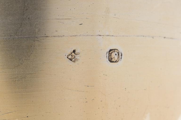 Poinçons (pied, coupe, fausse-coupe) : 1) poinçon de fabricant de Marie Thierry (fils) : dans un losange vertical, les initiales M et T séparées par un coeur percé de deux flèches, deux étoiles, une en chef et l’autre en pointe ; 2) poinçon de titre et de garantie Paris et départements, argent 1er titre, en usage à partir de 1838.