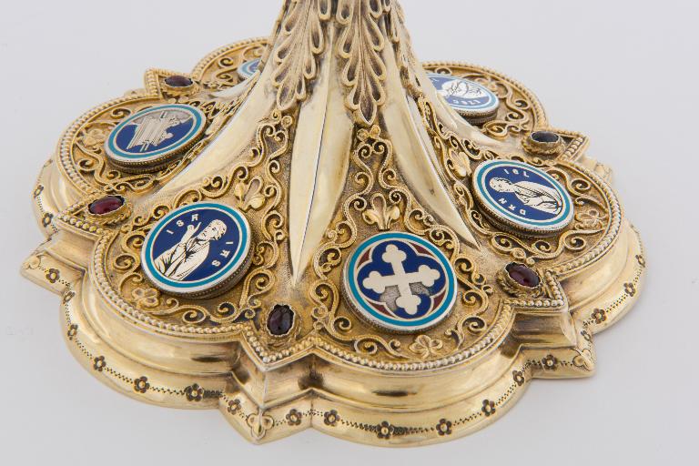 Sur le pied à lobes et redents, souligné par une frise perlée, alternent respectivement des médaillons émaillés et des grenats. Un décor de faux-filigrane formant des volutes perlées couvre la quasi-totalité du pied. La descente est à feuilles lancéolées unies et feuillages réunis par une ceinture de feuilles de vigne où naît la tige gravée de volutes. Le nœud aplati est orné de six boutons avec des turquoises et des pierres vertes serties. La fausse-coupe reprend les éléments du décor du pied : volute en faux-filigrane, feuilles lancéolées avec des grenats en cabochon dans des corolles de fleurs sur tige. Ce calice forme une chapelle d’orfèvrerie (incomplète) avec des burettes dans un coffret en chêne portant la marque du fabricant.
