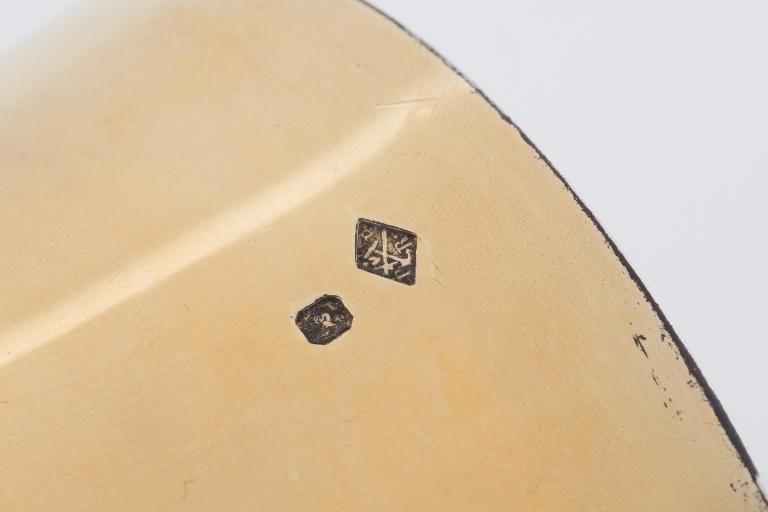Poinçons (pied, coupe, fausse-coupe) : 1) poinçon de fabricant de Placide Poussielgue-Rusand : dans un losange horizontal, les initiales P, P et R en pointe, une ancre et une croix en sautoir au milieu, un cœur en chef ; 2) poinçon de titre et de garantie Paris et départements, argent 1er titre, en usage à partir de 1838.
