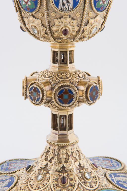 De forme néogothique, ce calice comprend un pied octolobé et une tige à section octogonale. Le pied et le nœud portent huit médaillons émaillés dans les tons bleu et rouge. Quatre sont ornés de motifs géométriques et quatre autres d’une scène. Le haut du pied montant vers la tige est orné de feuilles de chênes et de cabochons de grenats et cristal de roche. La coupe est couverte d’une fausse-coupe divisée en huit arcatures ornées d’un médaillon rond, quatre portant un motif géométrique et quatre un personnage en buste. Les médaillons sont émaillés avec des motifs sur fond bleu de roi. Les quatre médaillons du pied présentent : la dernière Cène avec Jésus entouré de Jean et de Pierre, Jésus crucifié entre deux femmes personnifiant l’Église et la Synagogue, la descente de croix et l’incrédulité de saint Thomas. Sur la fausse-coupe, les quatre médaillons figurent les prophètes Ezéchiel, Daniel, Isaïe et Jérémie.