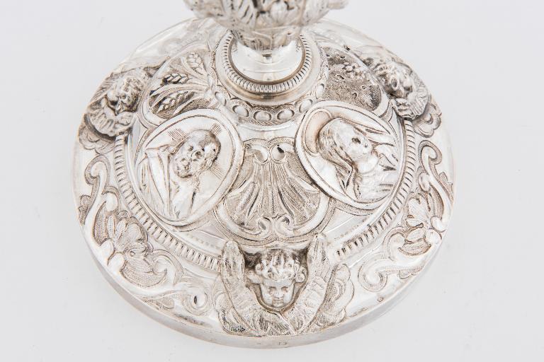 Ce ciboire présente sur son pied trois médaillons dans lesquels on retrouve le Christ, la Vierge et saint Joseph. Il est intéressant de noter que les figures de la sainte Famille sont identiques sur les trois œuvres de l’orfèvre Dejean conservées dans les églises dinannaises. Sur la fausse-coupe, trois paires de chérubins, légèrement de profil, tranchent avec la posture hiératique des six autres chérubins, présents sur le pied et le couvercle. Le décor végétal, épis de blé, grappes de raisins et roseaux, renvoient à l’Eucharistie. Malgré sa petite taille, ce ciboire conserve les proportions élancées qui caractérisent la production de la première moitié du XIXème. La présence de décors à volutes, le traitement des chérubins mais également la forme du nœud confortent l’influence rocaille qui caractérise une grande partie du travail de l’orfèvre.