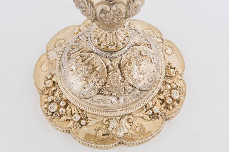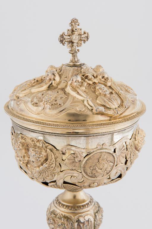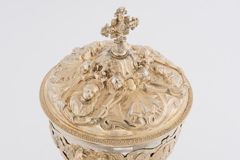 Le nœud en balustre en poire renversée rappelle les motifs utilisés sur les nœuds des calices et ciboires de la seconde moitié du XVIIIème siècle.Le pied comporte trois scènes bibliques représentant la Cène, l’Agonie du Christ au Jardin des oliviers et la Crucifixion. Dans les médaillons de la fausse-coupe apparaissent les trois vertus théologales sous les traits de trois femmes représentant successivement la Foi, l’Espérance et la Charité. Sur le couvercle du ciboire, trois cadres accueillent les figures de la Vierge Marie, de saint Joseph et du Christ. Les motifs figurés s’insèrent dans un décor de végétaux comprenant des épis de blé, des grappes de raisins, des roses et des joncs d’eau. La coupe du ciboire est portée par une série de palmes. Parallèlement aux symboles eucharistiques employés dans les décors de ce ciboire, de nombreux ornements témoignent d’une inspiration rocaille qui s’épanouit dans la première moitié du XVIIIème siècle comme l’utilisation de palmettes coquilles, de cabochons, de courbes et contre-courbes ainsi que les volutes en anse de panier. Sur le nœud et la fausse-coupe du ciboire se distinguent des chérubins. Sur le couvercle du ciboire apparaissent, derrière les cadres de la sainte Famille, des putti.