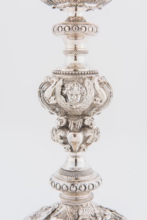 L’iconographie du pied met en scène la mort du Christ. On y retrouve l’Agonie au Jardin des oliviers, une scène composite reprenant les cinquième, sixième et septième station du chemin de croix où le Christ trébuchant reçoit le secours de Simon de Cyrène et l’intervention de sainte Véronique, et enfin la mort sur la croix. Notons que ces trois scènes ne sont pas contraintes par un médaillon mais s’étendent largement sur le pied. Des grappes de raisins, encadrées de volutes en anse de panier, viennent séparer les scènes. Dans les trois médaillons de la fausse coupe,on identifie le Christ, la Vierge Marie et saint Joseph, reconnaissable au lys qu’il tient dans sa main. Par sa forme élancée, son nœud à balustre et sa profusion de décors, ce calice s’inscrit parfaitement dans la production de la fi n de la première moitié du XIXème siècle où l’influence des XVIIème et XVIIIème siècles demeure très présente. On notera toutefois une utilisation très discrète des palmettes et, sur la fausse-coupe, la présence de cartouches de cuirs découpés surmontant des chérubins. Ces chérubins se retrouvent également sur le nœud et sur le pied. La date de l’inscription, 1847, permet de rattacher ce calice aux premières années de production de l’orfèvre Dejean.