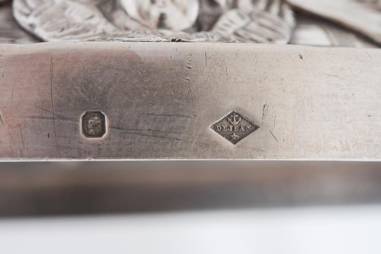 Poinçons (pied, coupe) : 1) poinçon de fabricant de Joseph- Philippe-Adolphe Dejean : dans un losange horizontal, DEJEAN, une ancre en chef, une étoile en pointe ; 2) poinçon de titre et de garantie Paris et départements, argent 1er titre, en usage à partir de 1838.