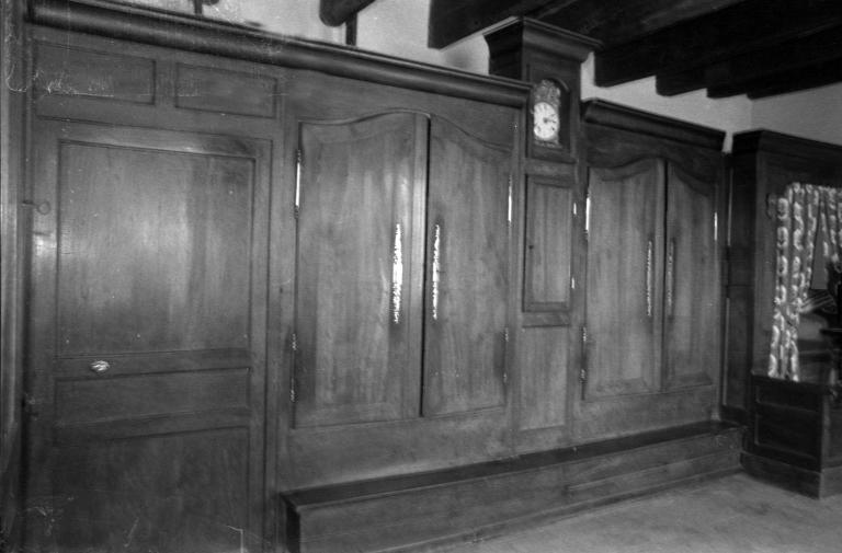 Cet ensemble mobilier traditionnel en chêne foncé s’organise sur deux pans de mur d’une pièce rectangulaire à usage de cuisine située au rez-de-chaussée d’un logis de ferme datée du milieu du 19e siècle. Il se compose de lits clos superposés garni de rideaux (doté d’un volet mobile faisant palier qui se repousse à l’intérieur du lit), d’une armoire, de la porte de l’office, de deux armoires encadrant une horloge à balancier et d’un lit clos (situé au plus près de la cheminée). Deux bancs-coffres permettent de monter dans les lits clos. Surmontant la cheminée, un râtelier en bois faisant étagère, supportait en 1973 des lampes à pétrole ou à huile, deux chandeliers, un crucifix et une statuette. Immédiatement à droite de la cheminée se trouvait la cuisinière. De part et d’autre de la table de cuisine faisant face à la fenêtre orientée vers le sud, deux bancs. Un porte-cuillère est suspendu à une poutre du plafond.