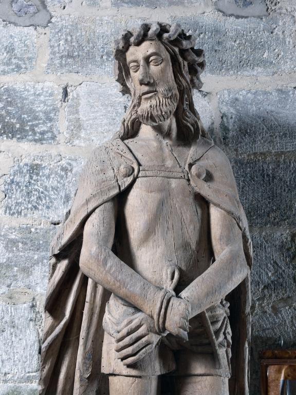 Le Christ est debout. Il porte le perizonium et un manteau sur ses épaules, attaché par un lien et deux boutons au niveau de son torse. On peut apercevoir l’emplacement de ses côtes.