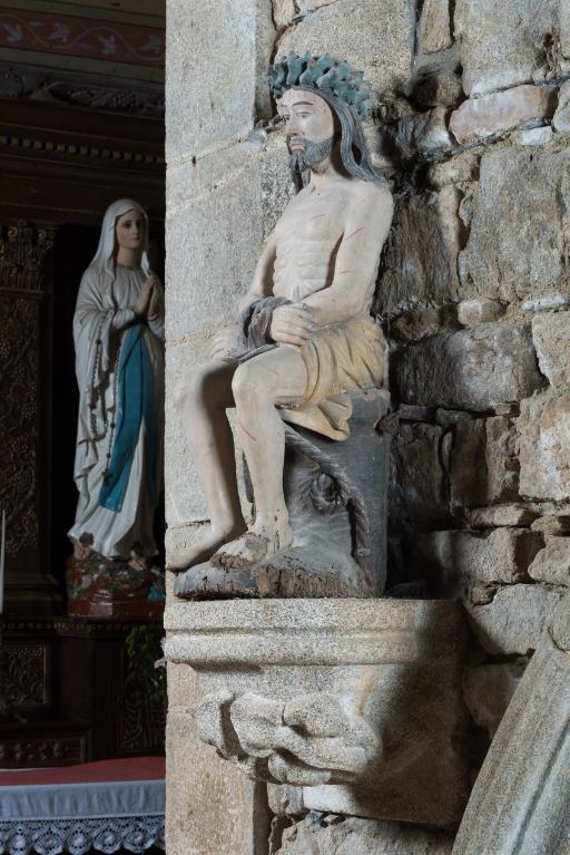Le Christ est assis. Il porte le perizonium. On peut voir ses côtes. Son corps est marqué par des blessures rouges qui rappellent les coups de fouet de la Flagellation.