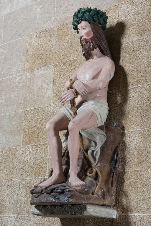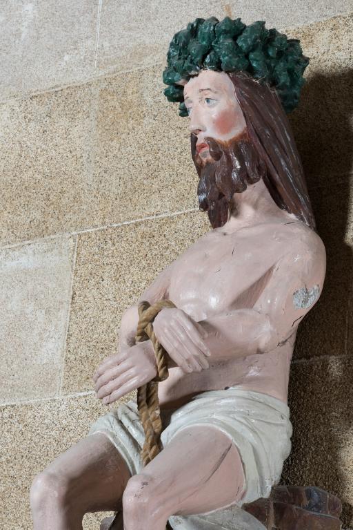 Le Christ est assis sur un muret. Il porte le perizonium.