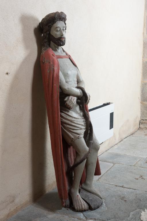 Le Christ est debout. Il porte un perizonium et le manteau pourpre sur ses épaules. Son corps est maigre, ses côtes sont apparentes. La couleur de sa peau est presque grise ce qui lui donne un air cadavérique.