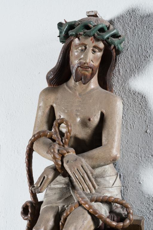 Le Christ est assis sur le manteau pourpre posé sur un muret en pierre. Il porte le perizonium. Son torse est nu et maigre : on peut compter ses côtes.