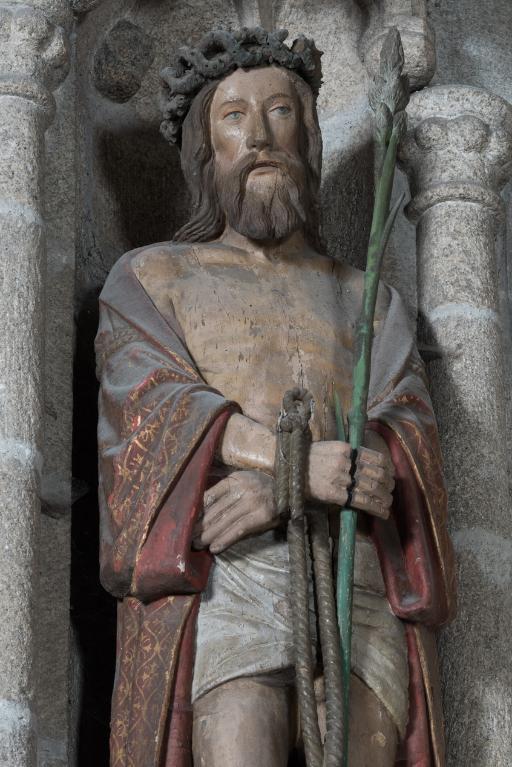 Le Christ est debout. Il porte le perizonium. Sur ses épaules retombe un manteau pourpre avec des détails dorés qui imitent des broderies. On peut voir ses côtes.