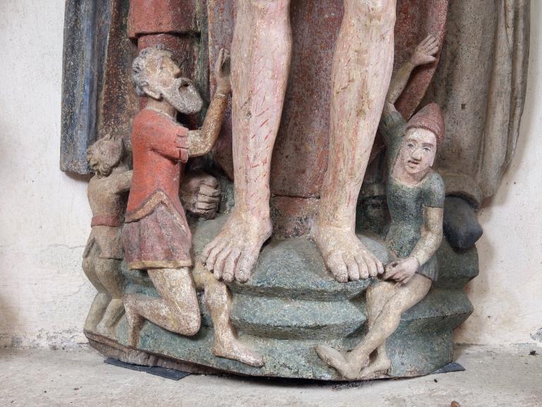 A ses pieds se trouvent trois petits personnages. Les deux personnages de gauche semblent implorants. Celui de droite au contraire est plutôt amusé par la situation et a un air moqueur.