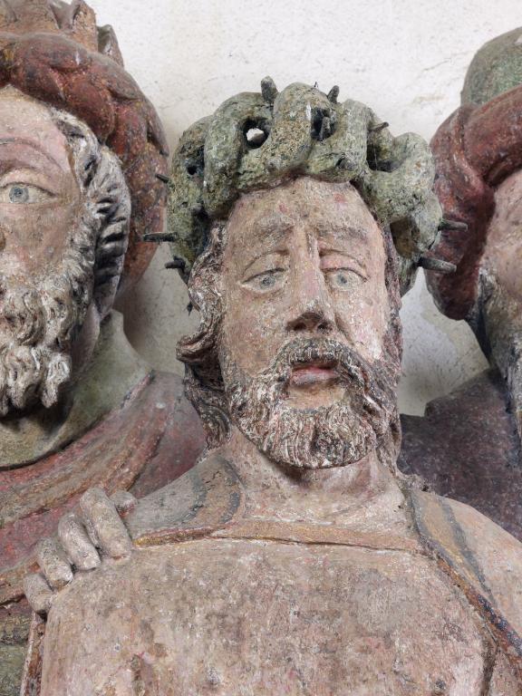 Il est coiffé d’une couronne aux épines saillantes. Des gouttes de sang perlent sur son front. Ses yeux sont ouverts mais son regard est tourné vers le sol.