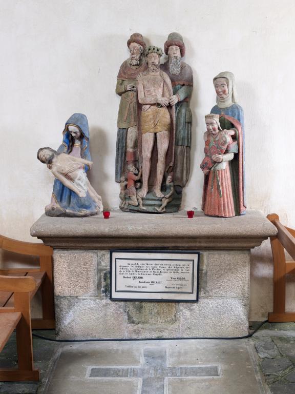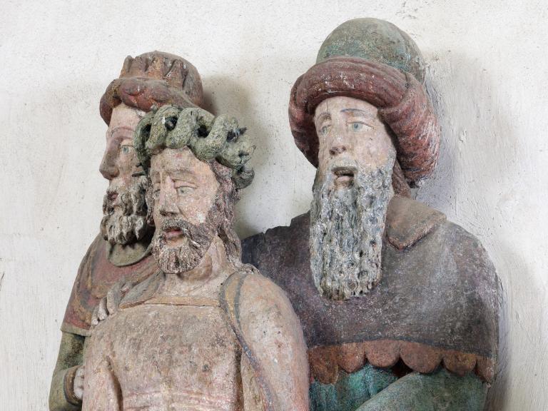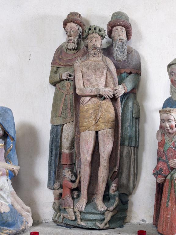 Le Christ est debout, tenu et présenté par deux personnages. Le personnage de gauche porte une couronne, il s’agit du roi Hérode. Le personnage de droite présente le Christ au peuple, il soulève le manteau de sa main gauche et pose sa main droite sur l’épaule de Jésus. C'est Ponce Pilate.