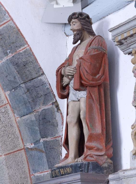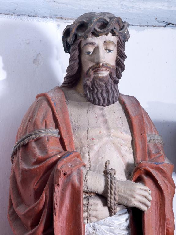 Ses mains sont attachées par un nœud serré. Cette statue est similaire à celle de la chapelle Sainte-Noyale à Noyal-Pontivy. Cela permet de penser que l’Ecce homo tenait un roseau ou une palme dans sa main droite.