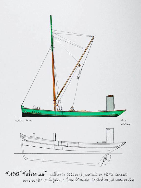 Puis on le retrouve en 1952 à Tréguier. Inscrit le 21 août 1952 à Tréguier : TG1293 TALISMAN. Armateur : Pierre Le Forestier, Pleubian ; puis Pierre Derrien, Lannion.
