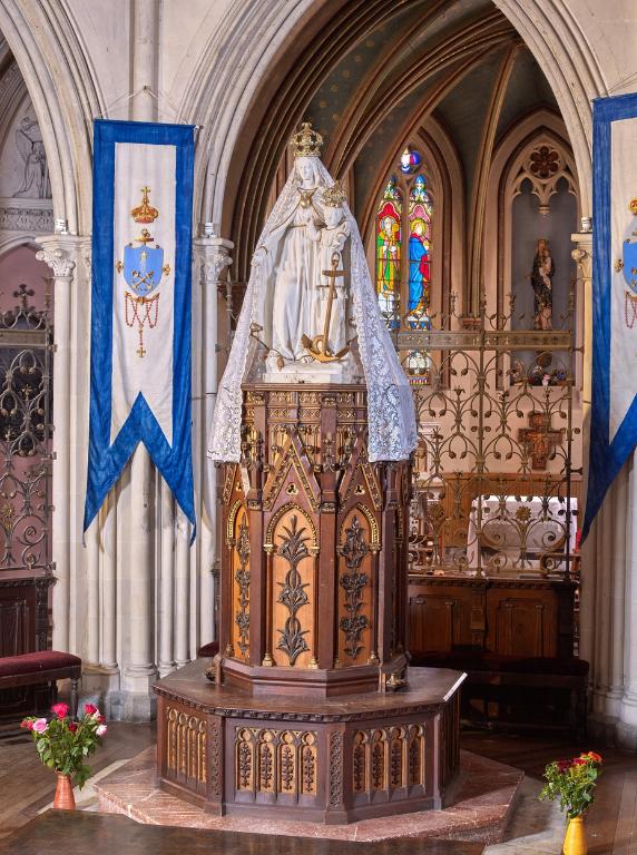 Cette statue représente une Vierge à l'Enfant. Le Christ se tient debout sur un tronc et tient une ancre, symbole d'espérance, dans sa main gauche. Quant au tronc, il symbolise l'arbre de Jessé, arbre généalogique du Christ. La statue est monochrome avec des touches de peinture dorée sur la ceinture, le sacré-cœur et l'ancre.