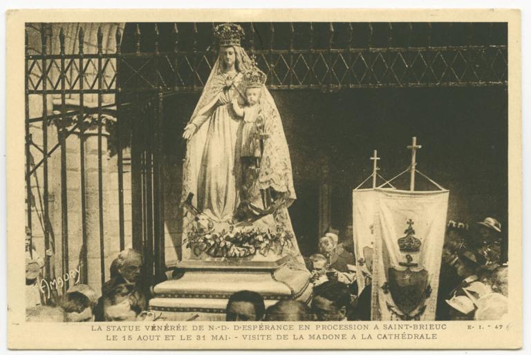 Commandée par l'abbé Paul Prud'homme et réalisée en 1852 par l'artiste briochin Pierre Ogé (1817-1867), elle est couronnée en 1865. Le jour du couronnement, elle est processionnée par un groupe de marins (Lettre-circulaire de Mgr l'évêque de Saint-Brieuc et Tréguier pour le couronnement de Notre-Dame d'Espérance). La statue est aussi processionnée les jours de pardons et de grandes cérémonies comme le pèlerinage d'action de grâces de 1920. Hors période de pardon, elle repose dans le chœur de la basilique, sur un socle. Ce socle faisait à l'origine partie d'un trône monumental néogothique en bois, sculpté en 1878 et destiné à accueillir la Vierge.