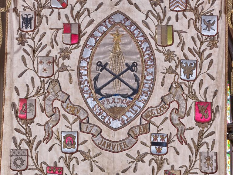 La bannière est donc commandée suite au vœu de l'évêque par l'Archiconfrérie de Notre-Dame d'Espérance afin de remercier la Vierge d'avoir épargné Laval et la Bretagne. Elle est réalisée à grand frais par la maison rennaise Rouxel-Ledain qui la vend 6000 francs. Cet atelier de broderie, qui devait avoir une certaine renommée, est aussi connu pour avoir confectionné la bannière du vœu de Notre-Dame de Bonne-Nouvelle à Rennes, en 1861.