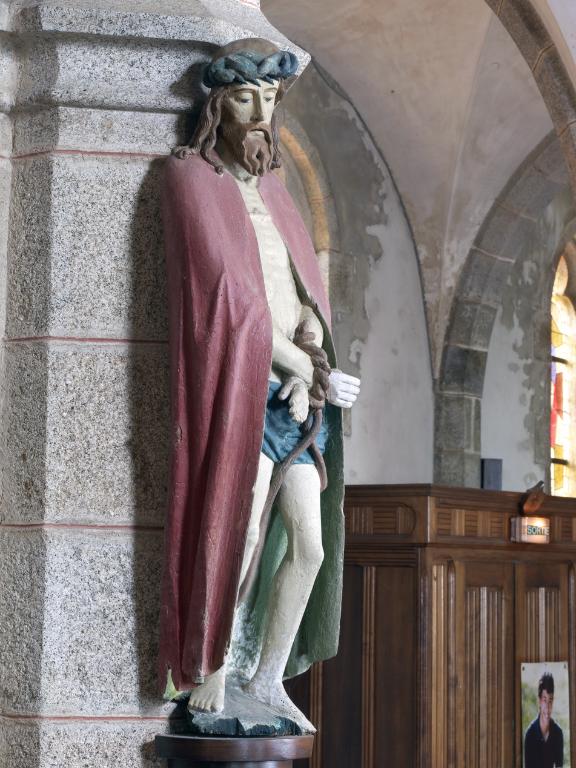 Il porte une imposante couronne d’épines. Sa tête est légèrement inclinée vers le sol. Ses cheveux et sa barbe forment des boucles serrées même si les repeints empêchent à certains endroits de les distinguer