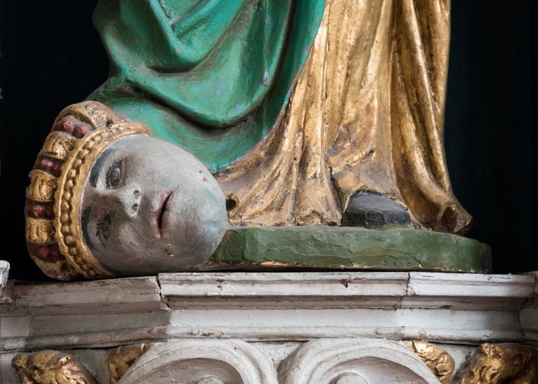 La tête couronnée déposée aux pieds de la figure principale est très travaillé. Le teint tranche avec celui de la sainte : la pâleur de la tête associée au regard fixe de l'homme indique qu'il n'est pas vivant, comme vaincu par la figure qui pointe son épée dans sa direction.