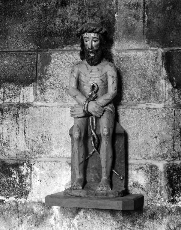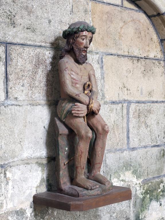 Le Christ est assis. Il revêt le perizonium. Son corps est couvert de blessures rouges qui sont les marques de la Flagellation. Il est plutôt maigre (on devine la forme de ses os au niveau des jambes et du torse).