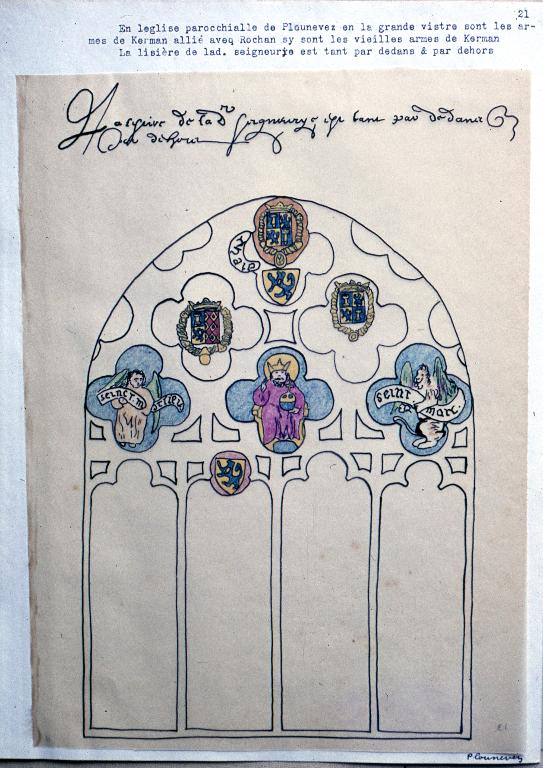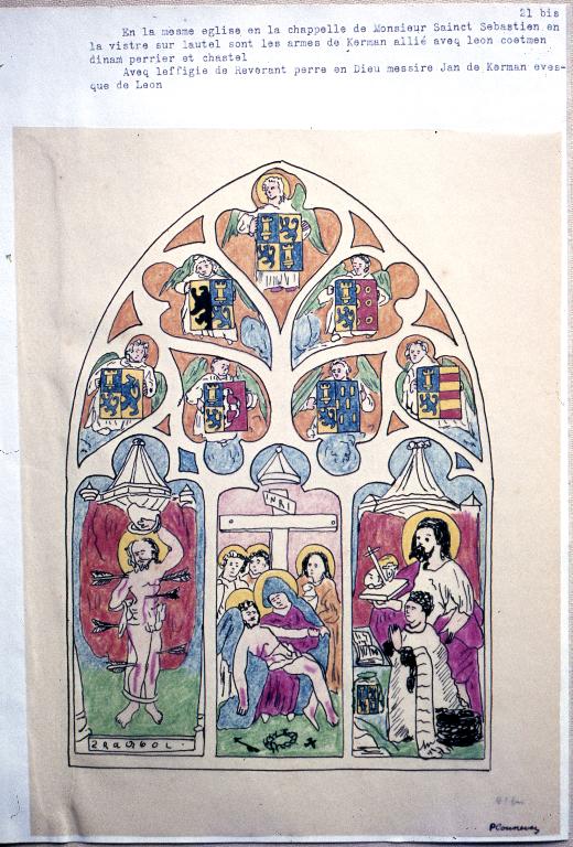 BOURICQUEN, Jan. Bref estat es preminences du marquis de Kerman et conte de Seszploe de mesme quelles sont es eglisses covent et chapelles tant en pierre boys viltres que lisières en Leon. Visite recuilli es ce presant livre faict pour hault et puissant mesire Charles de Maillé chevalier de l'Ordre du roy, gentilhomme ordinaire de sa chambre, seigneur marcquis de Kerman conte de Seizploue, baron de la Forest, [etc], par son peintre et vistrier humble et fidel serviteur Jan Bouricquen en 1614.