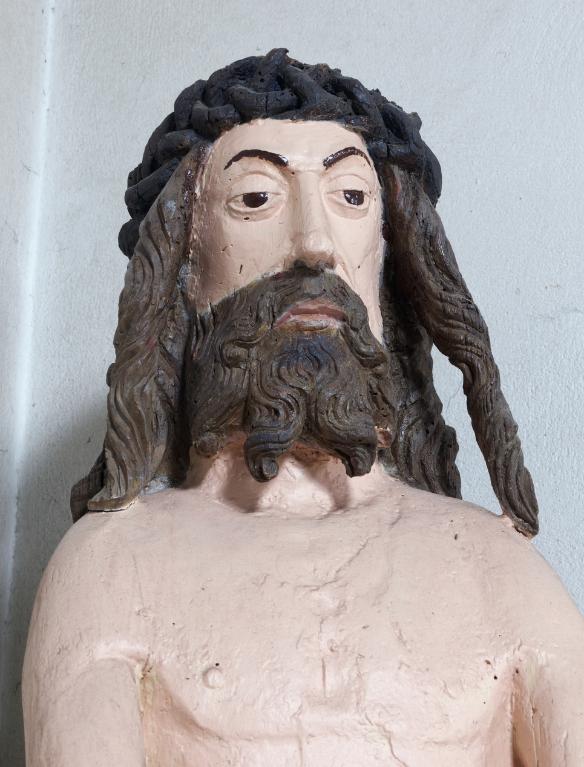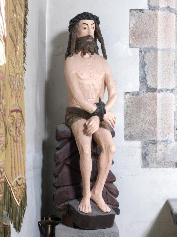 Le Christ est assis sur un muret en pierre. Il a pour seul vêtement le perizonium. Son corps est plutôt maigre, on peut deviner ses os au niveau de son torse.