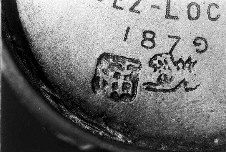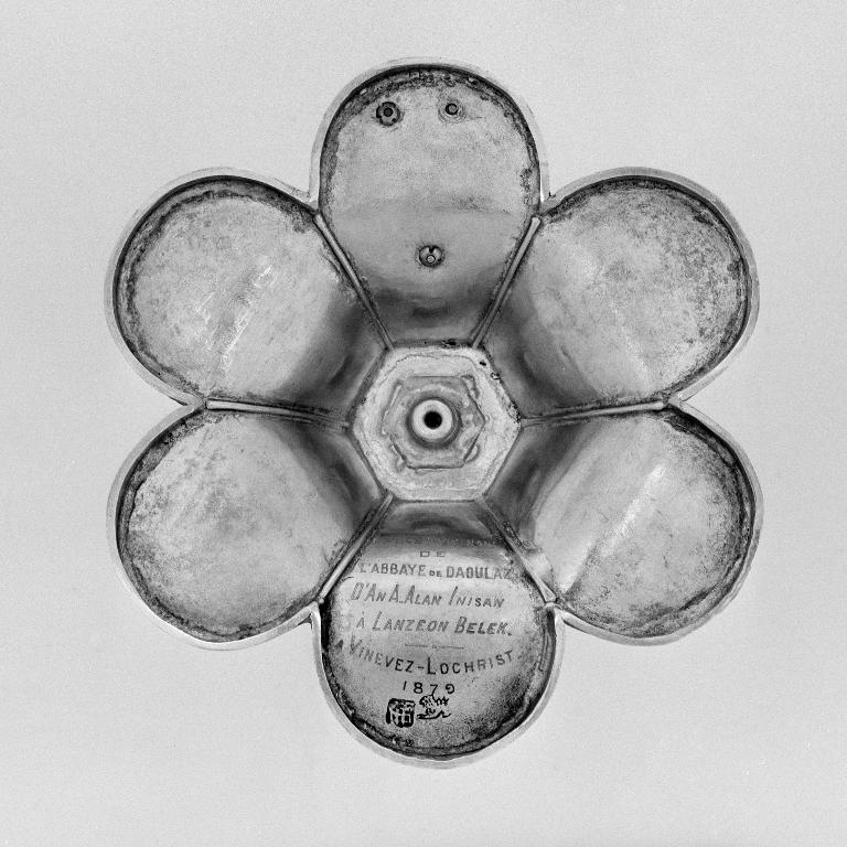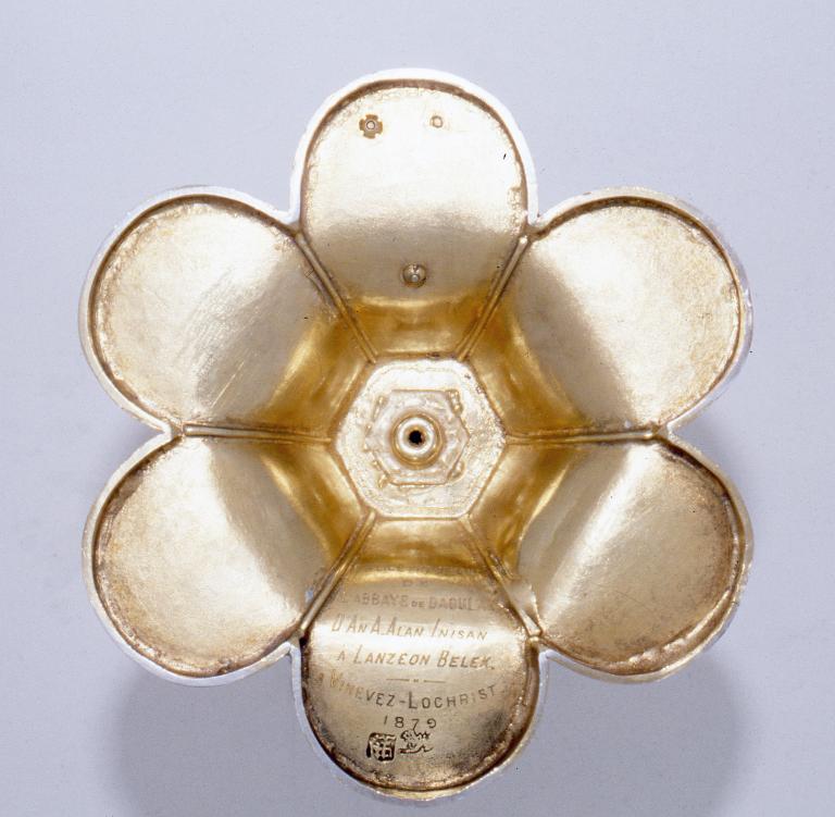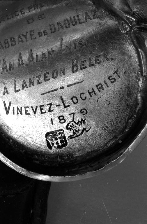 Poinçon et inscription sous le pied ; lettre-date : hermine passante, lettre M entre les pattes ; inscription gravée : CALICE PROVENANT DE L'ABBAYE DE DAOULAZ D'AN A. [OTROU] ALAN INISAN A LANZEON BELEK VIVENEZ ; LOCHRIST 1879 ; poinçon de maître : Y P dans un rectangle.