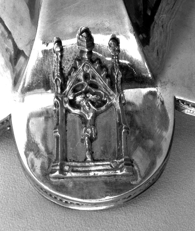Christ en croix sous un dais sur l'un des lobes du pied ; dieu biblique sur la patène..