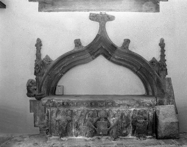 Le premier tombeau, sous une verrière aux armes des Carman, ne présente qu’une seule face ; il est encastré dans un enfeu surmonté d’une accolade ; à droite, un bénitier. Il s’agit là d’un tombeau destiné à la famille de Carman.