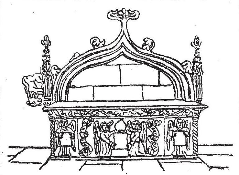 L’église ayant été plusieurs fois reconstruite, on peut facilement imaginer que les panneaux du cénotaphe ont été remontés dans le désordre. C’est ainsi que l’on trouve sous l’autel de la croisée du transept, deux fragments provenant de l’un des grands côtés du cénotaphe.