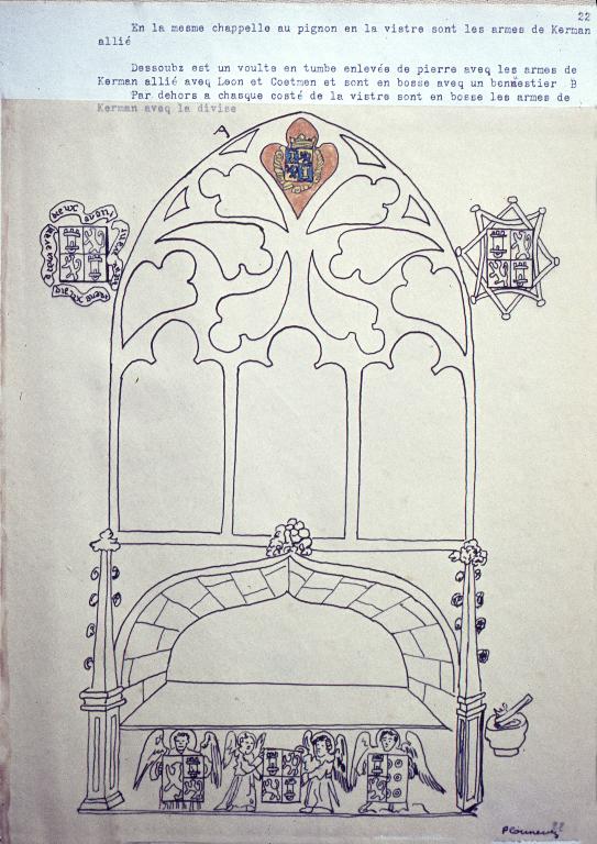 À gauche, un ange porte : mi-parti, au 1 : d'or au lion d'azur (famille de Carman) ; au 2 : écartelé, en a : d'azur à la tour d'argent portée par une roue de même (famille de Lesquelen) ; en b : d'or au lion d'azur. L’alliance entre les familles Carman – Lesquelen eut lieu à la fin du 13e siècle.
