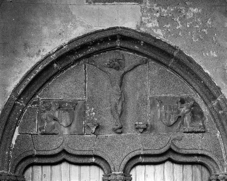 Portail en arc brisé à deux baies en accolade soutenant un tympan. Anges portant les écus de kersantite.