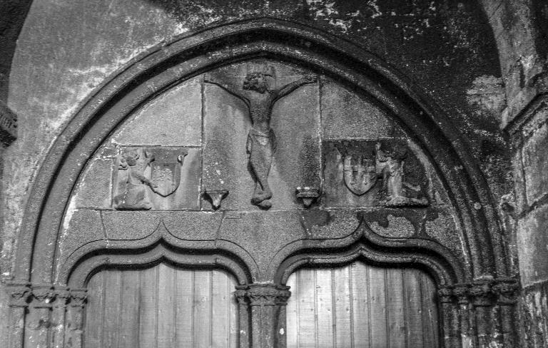 Portail du milieu 15e siècle utilisant en remploi un Christ du 14e siècle.